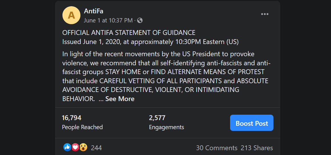 The below message was published to our Facebook page at the date and time indicated in response to widespread attempts by agents provocateur to incite aggression and violence while pretending to be doing so under the AntiFa “banner.” We issued this statement of guidance to help keep the legitimate protesters out of the way of the bad actors, in general to make it more difficult for anyone to be fooled into thinking “we” were responsible and to keep honest anti-fascists out of harm’s way for a minute until the bad actors faded out and the authorities could no longer plausibly pretend to think we were conducting, organizing, directing, or even condoning their behavior.